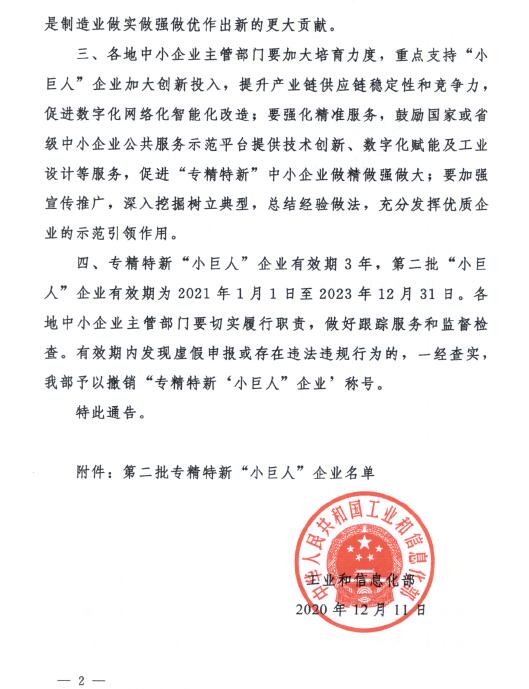 2020年12月,根据中华人民共和国工业和信息化部发布的通告,思泉新材获得第二批专精特新“小巨人”企业的称号。