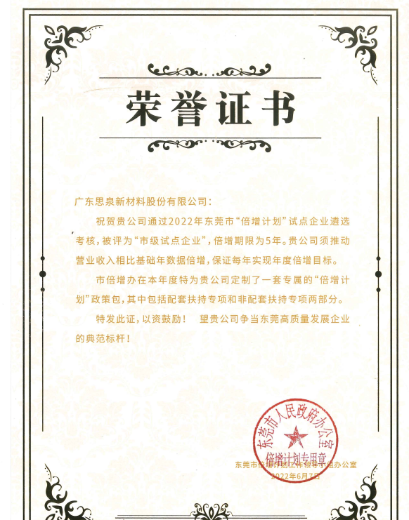 经2022年东莞市倍增计划试点企业遴选考核,广东思泉新材料股份有限公司(以下简称“思泉新材”)被评为“市级试点企业”。